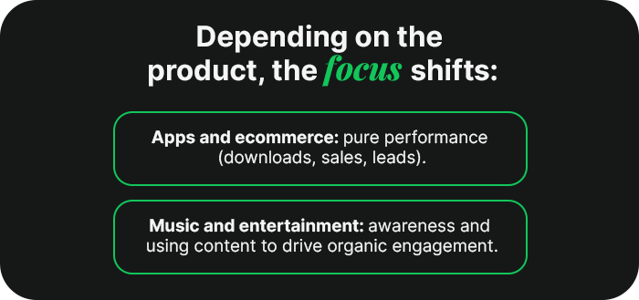 In many cases, what brands need most is awareness and, therefore, an engagement-driven campaign. But it depends on the product. For apps or ecommerce, performance matters more, and you can measure it through promo codes, trackable links or app-specific downloads. For these kinds of products, those KPIs become essential.
